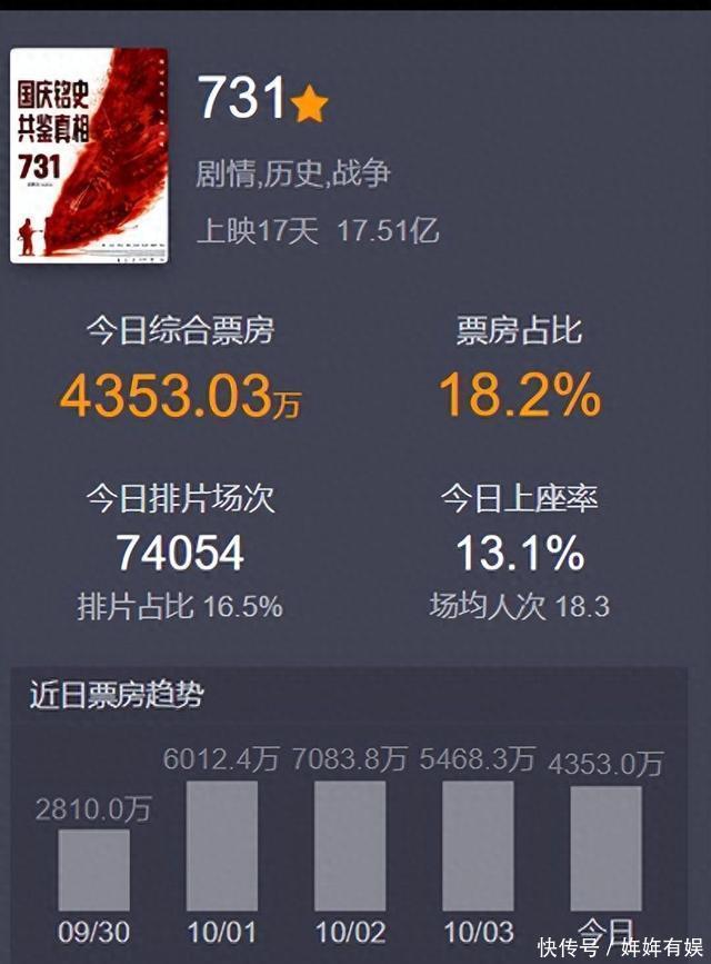 接连几天,都是极高的票房。 使得《731》在一众国庆档电影中,排名始终靠前。